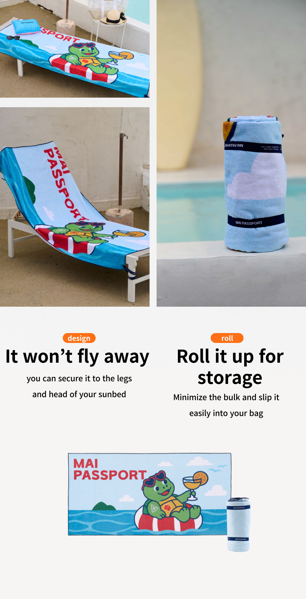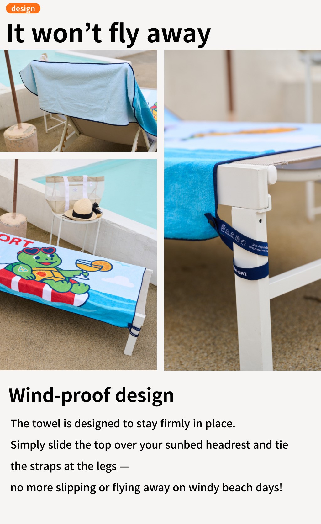 Introducing our wind-proof beach towel — designed to stay securely attached to your sunbed, so it won’t fly away.